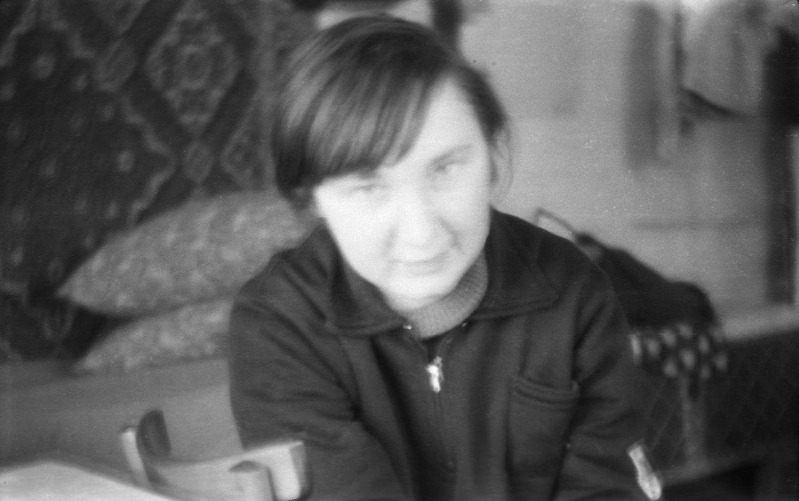 Comment (Slepenkova (Seburova) Rima Konstantinovna): Éva Schmidt in Matrёna Grigor'evna Seburova's house. Éva Schmidt is sitting on a chair. Behind her is a bed made....show more