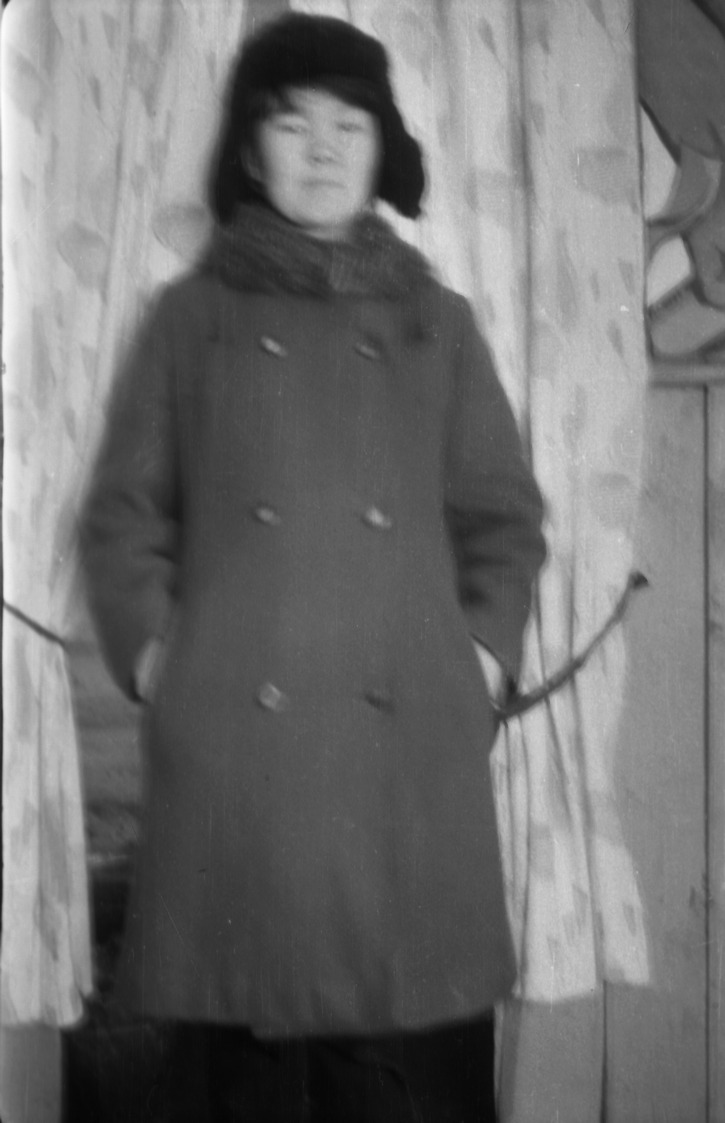 Comment (Slepenkova (Seburova) Rima Konstantinovna): Taisija Stepanovna Seburova in her mother Matrёna Grigor'evna Seburova's house. Taisija Stepanovna Seburova is standing by the entrance of the house. There are linen curtains on both sides of the door....show more