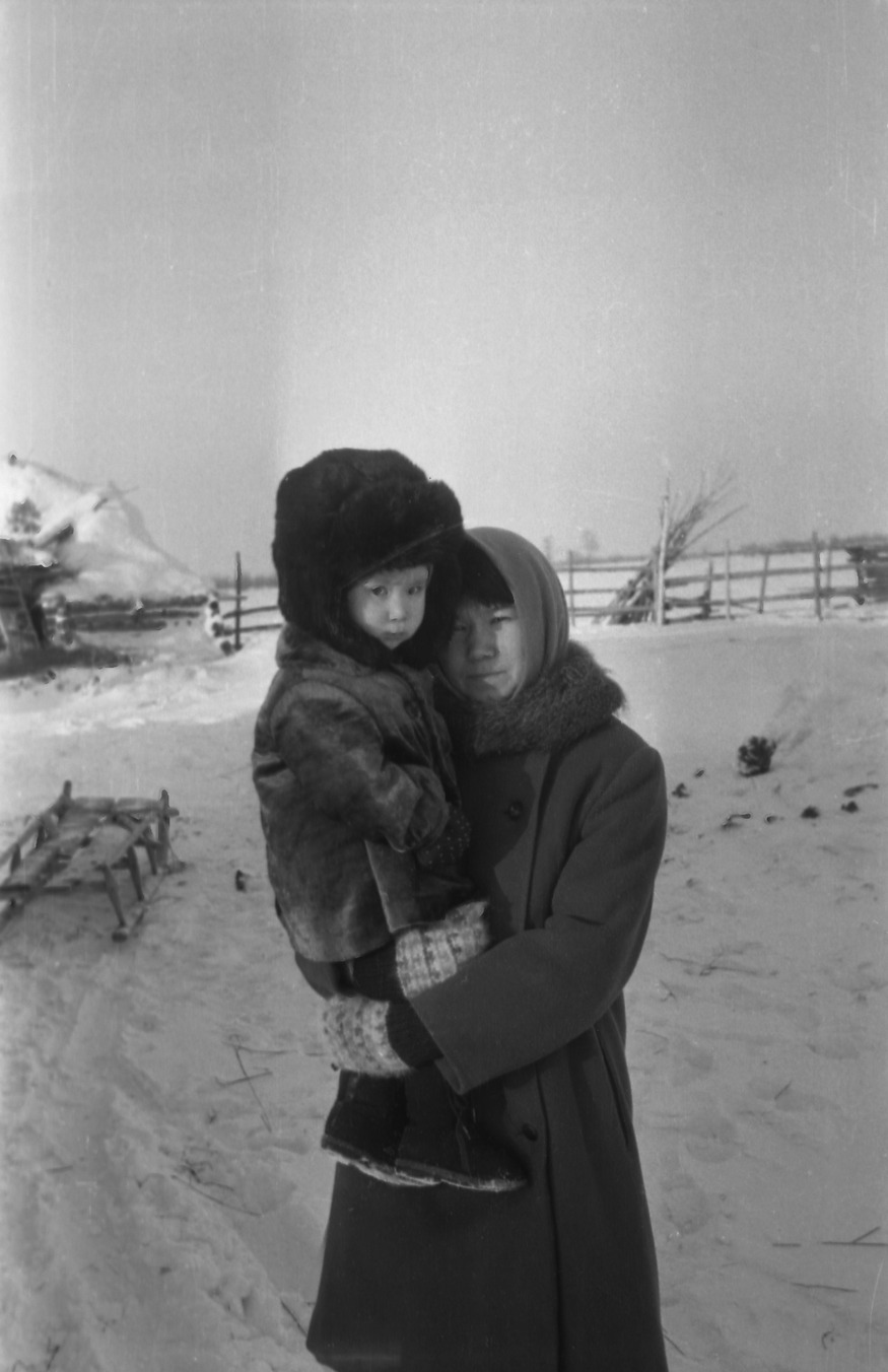 Comment (Slepenkova (Seburova) Rima Konstantinovna): Taisija Stepanovna Seburova is holding her niece, Jelena Kalistratovna Griškina in her arm, in Matrёna Grigor'evna Seburova's yard. They are both wearing Russian winter garment. They have mittens knitted from dog hair on their hands....show more