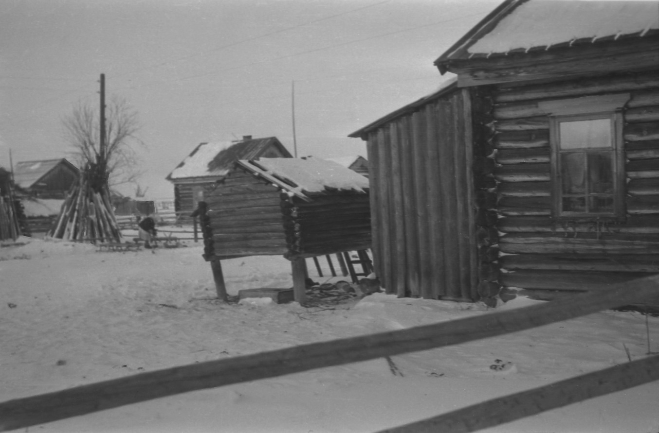Comment (Slepenkova (Seburova) Rima Konstantinovna): House of Aleksej Nikolaevič Griškin and his wife, who was called natal’ ĭmi ’Madam Natalia’ in the village. On the left side there is summer firewood stood up to dry. In the distance is Kalistrat Grigor’evič Griškin's house....show more