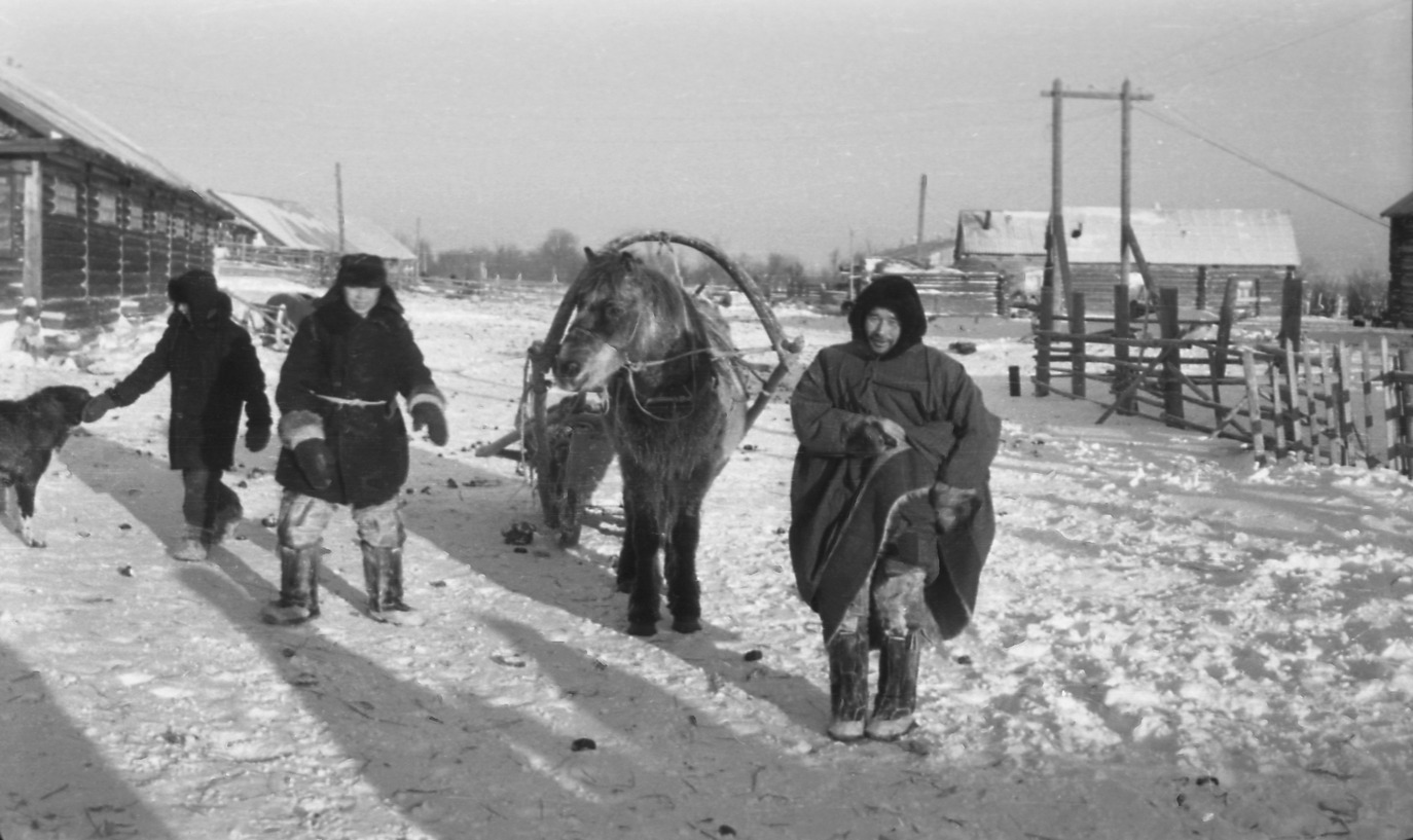 Comment (Slepenkova (Seburova) Rima Konstantinovna): The dog is playing with Pavel Kalistratovič Griškin. The bigger boy - Boris Mikhajlovič Seburov is wearing Russian clothes, on his feet he has 'wej', ’high fur boots’ made of reindeer fur. The man is Kalistrat Grigor'evič Griškin....show more
