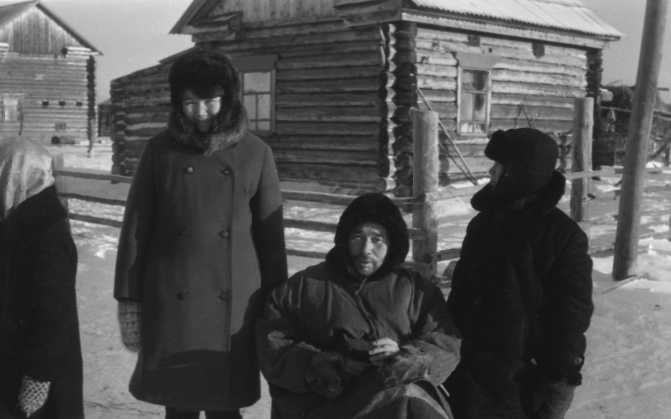 Comment (Slepenkova (Seburova) Rima Konstantinovna): To the left is Gennadij Grigor’evič Griškin's daughter, Svetlana (turning away), Taisija Stepanovna Seburova (standing), Kalistrat Grigor’evič Griškin seated, wearing a malica (mŏľśăŋ ’men's hooded pull-on fur coat’). The boy turning away is Pavel, Kalistrat Grigor’evič Griškin's son. Behind her back is the corner of the water extractor building and Gennadij Grigor’evič Griškin's house.