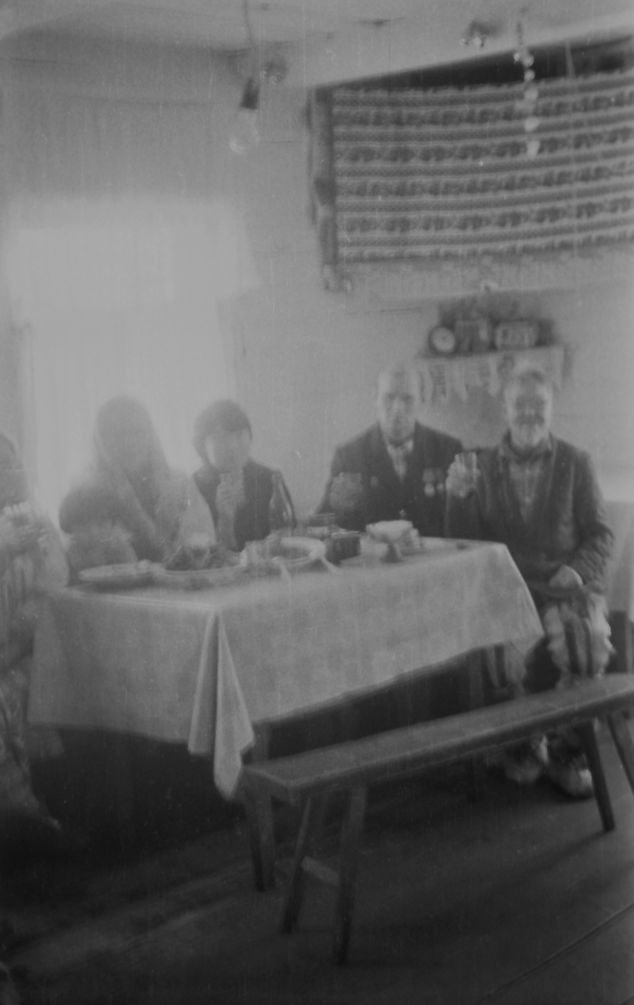 Comment (Slepenkova (Seburova) Rima Konstantinovna): Entertaining at Diomid Jegorovič Seburov's place. On the left edge, a little girl is sitting in her mother's lap. The discernible persons, Taisija Stepanovna Seburova, Kaksin Daniil Mitrofanovič and Seburov Diomid Jegorovič are sitting at the table....show more
