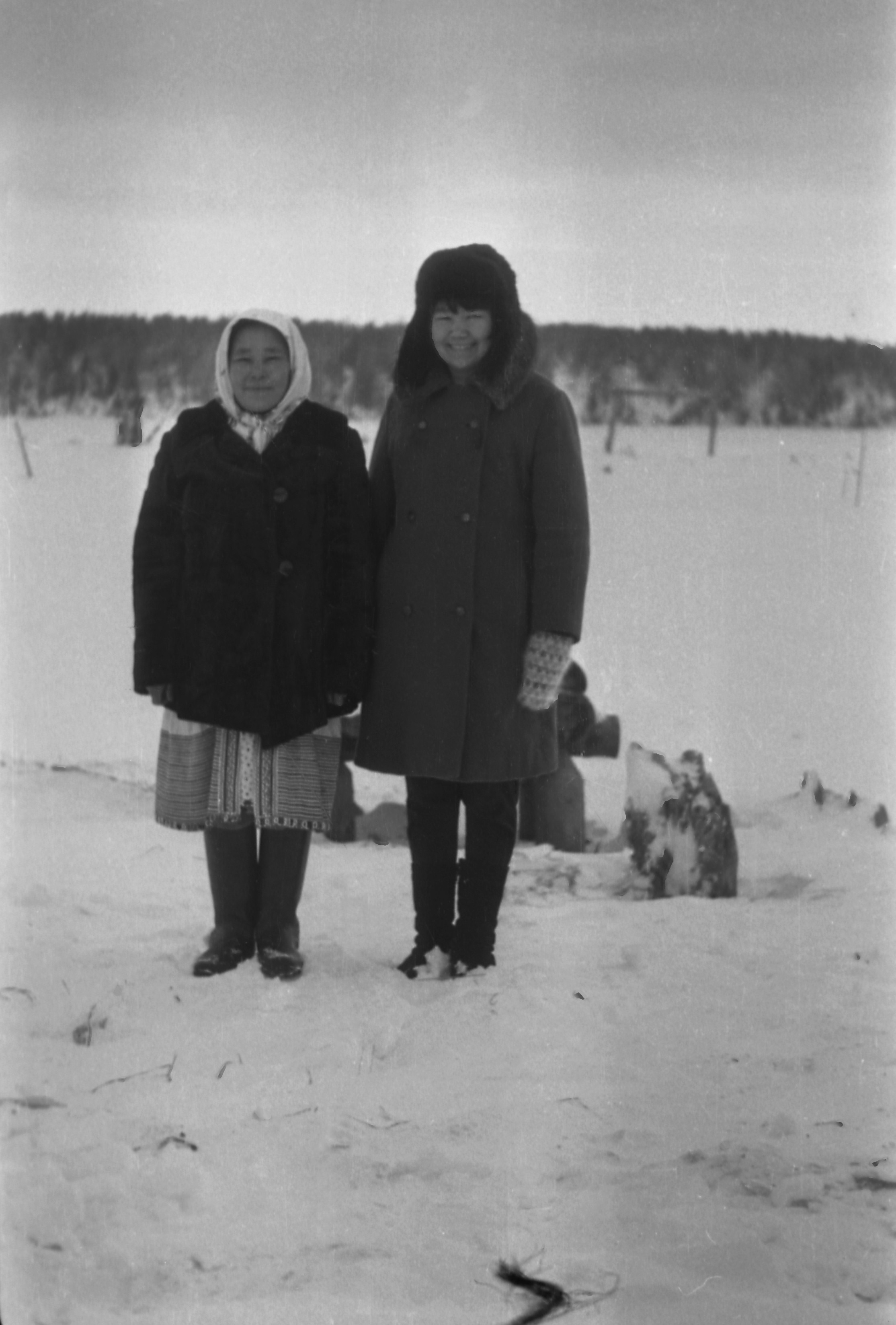 Comment (Slepenkova (Seburova) Rima Konstantinovna): With the winter taiga in the background, Ul'jana Deomidovna Kaksina (Seburova) and Taisija Stepanovna Seburova are standing. Ul'jana Deomidovna is the daughter of Diomid Jegorovič Seburov. On her head she has a scarf, she is wearing a plush coat with a Khanty women's cloak underneath (śăškan săχ ’linen cloak’)....show more
