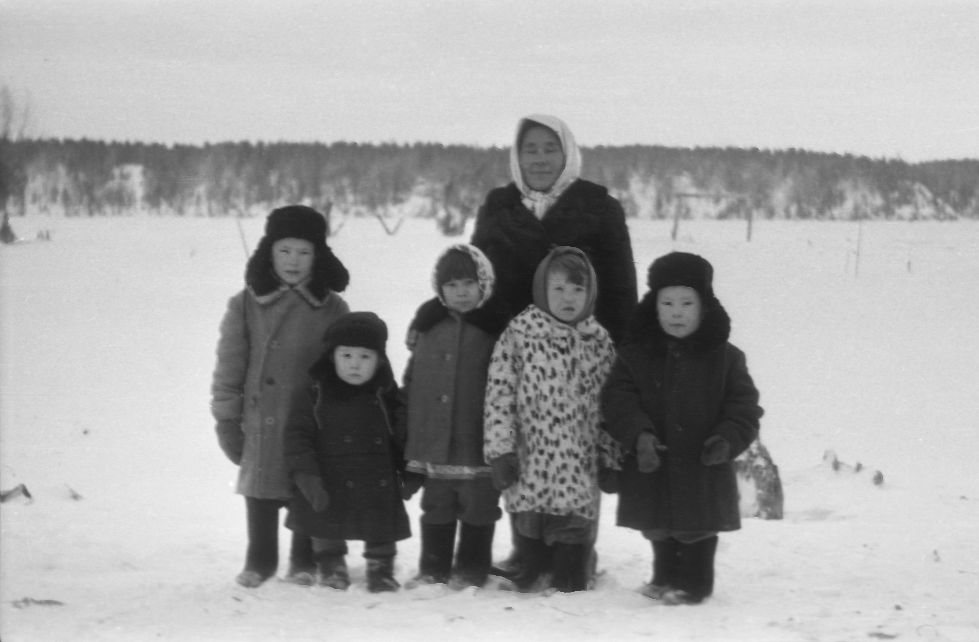 Comment (Slepenkova (Seburova) Rima Konstantinovna): The winter taiga in the background. Ul'jana Deomidovna Kaksina (Seburova), whom the village women used to call kaksin ĭmi ’Kaksin woman, wife’. The children: her nephews, Nikolaj and Gennadij Illarionovič Griškin; Ul'jana Diomidovna's daughter, Margarita Danilovna Kaksina, the little neighbor girl, Tatjana Savelevna Seburova and her nephew Leonid Illarionovic Griškin....show more