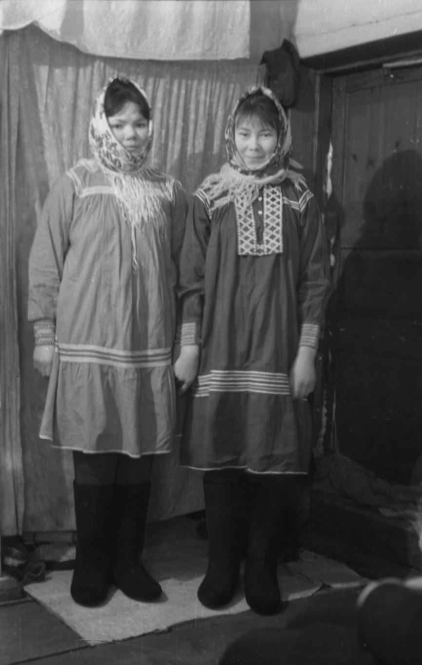 Comment (Slepenkova (Seburova) Rima Konstantinovna): Two girls in Khanty clothes, Rufina Emanuilovna Griškina and Jelizaveta Stepanovna Seburova. They are wearing floral head scarves, χănšaŋ ŏχšam ’patterned scarf’. They wear Khanty clothes, but they have felt boots on their feet....show more