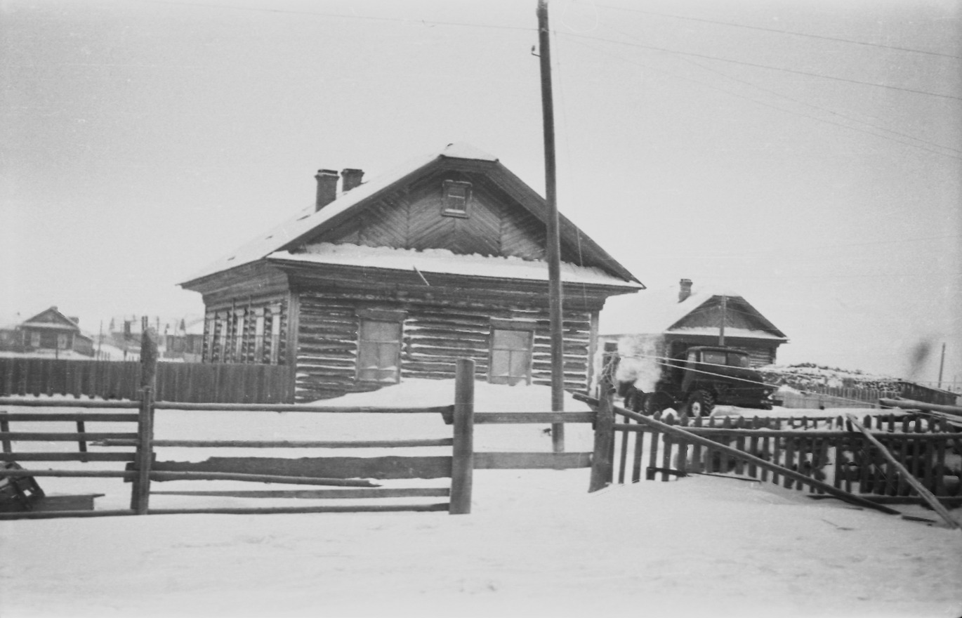 Comment (Slepenkova (Seburova) Rima Konstantinovna): Fence made of poles. Farther off a big house. This used to be a service house, today [2024] it is a privately owned grocery store....show more